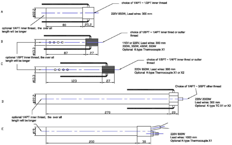 A. 220V 850W, lead wires: 300 mm B. 110V or 220V, lead wires: 300 mm, 200 W, 350 W, 450 W and 550 W, optional built-in thermocouple C. 220V 850W, lead wires: 300 mm, optional built-in thermocouple D. 220V 2000W, lead wires: 300 mm, optional built-in thermocouple E. 220V 800W, lead wires: 1000 mm, optional built-in thermocouple