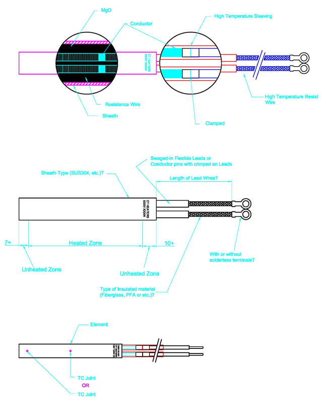 How to order To order your Cartridge Heater, please specify: l Volts, Watts, ODΦ of your actual insertion holes (tolerance of insertion holes: if the overall length of element is ≦100, then the ODΦ of element will be +0, -0.03~0.04mm. if the overall length of element is >100, then the ODΦ of element will be +0, -0.05~0.1mm l Overall length of element (excluded the lead wires), length of heated zone l Lead wire length (Standard lengths 300 mm will be supplied if not otherwise specified.) and lead orientation l Internal thermocouple available upon request